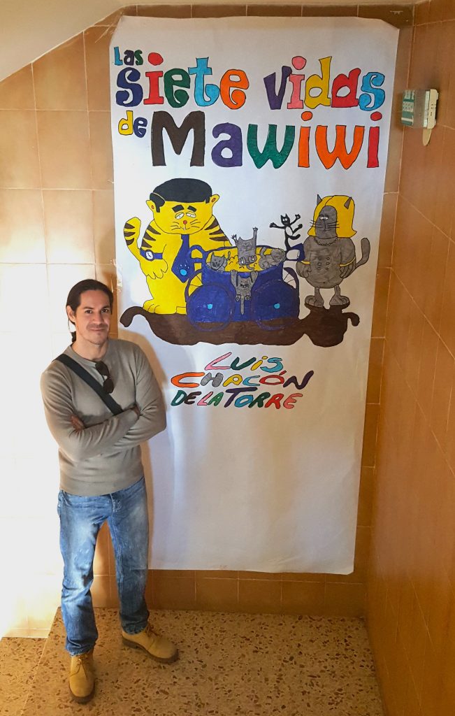 Culminando las jornadas del Día del Libro, visitó Luis Chacón el Colegio Público Santiago Apóstol, en Albaladejo. Ya la recepción prometió, pues esperando en los pasillos del colegio descubrió el autor valdepeñero unas enormes ilustraciones de Mawiwi. No pudo reprimirse y se hizo unas fotos. Véase el tamaño de los dibujos en comparación con él. ¡Un trabajazo, sí señor!