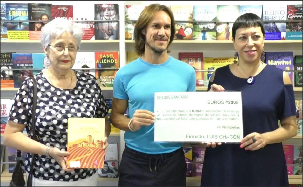 El pasado 14 de agosto de 2023 (con el fresquito de la tarde, ejem) Luis Chacón de la Torre entregó 200 € por las ventas de su libro de humor «Los jubilados los carga el diablo» a Rosae Quimerus, el que es ya tercer cheque desde que empezó la campaña, sumando así ya un donativo total de 600 € a nuestra querida asociación de mujeres afectadas por cáncer de mama de Valdepeñas. Este dinero se invertirá en la investigación de esta enfermedad.