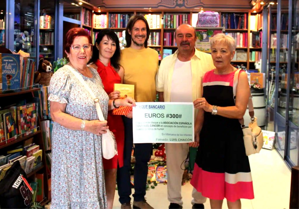 El pasado 6 de julio de 2024, en Papelería Mari, en Villanueva de los Infantes, Luis Chacón entregaba un cheque por valor de 300 € (simbólico, el dinero ya lo había transferido el escritor a la cuenta provincial de la AECC). De la AECC local, le acompañaron en la entrega la presidenta, Carmen García, una socia, María García, y el tesorero, Juan Antonio Romero.