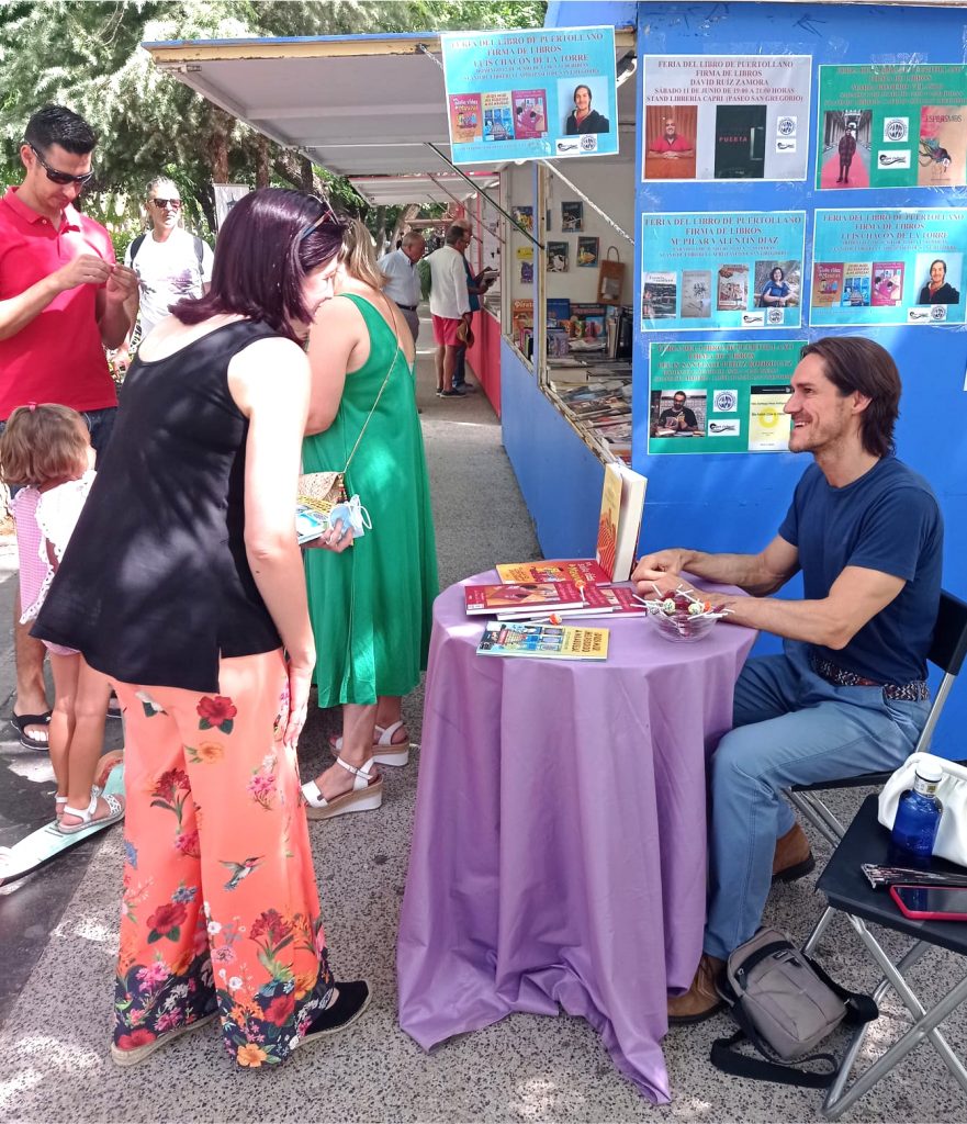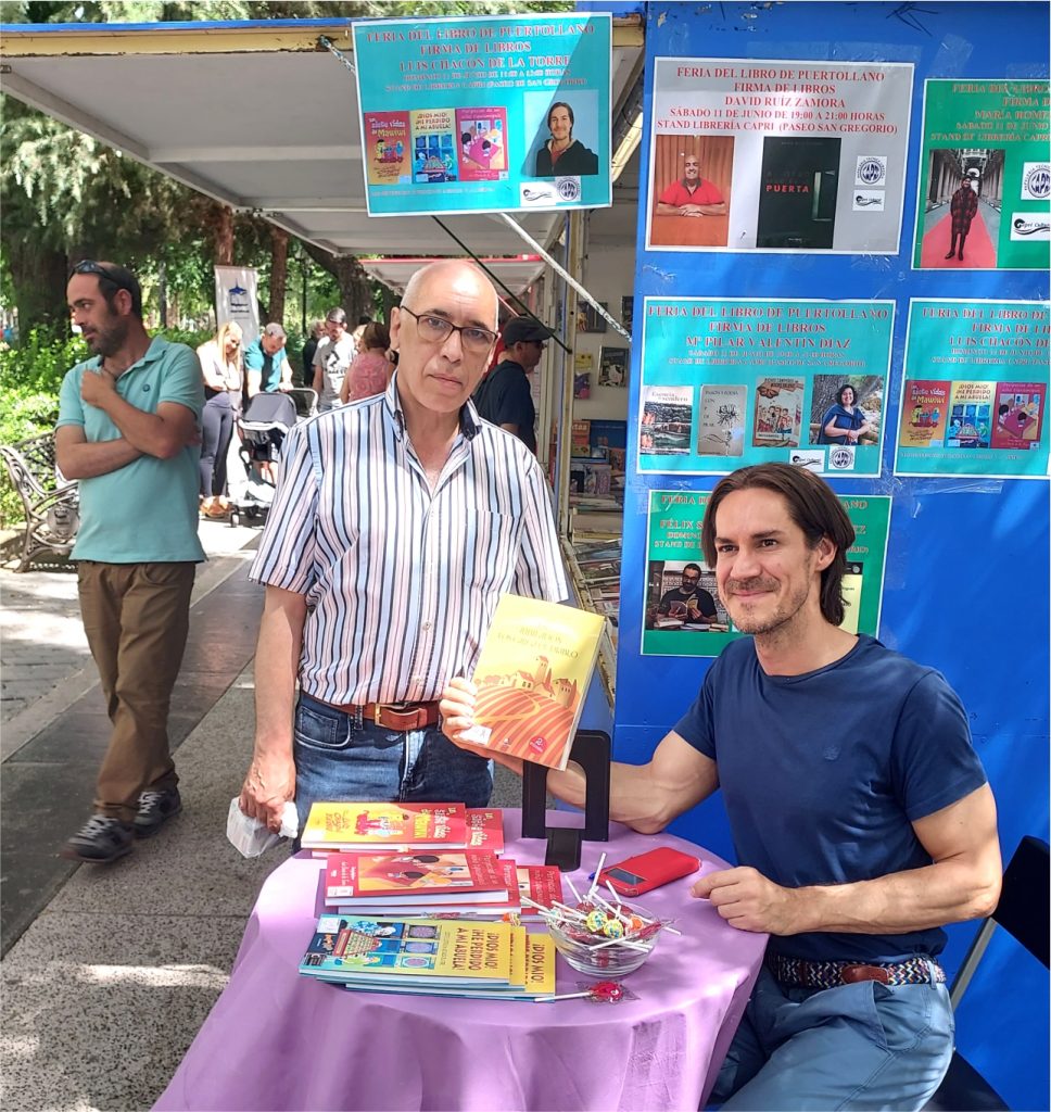 «Una experiencia muy positiva a pesar del «fresquito» que pasamos, ejem…», expresó con marcada ironía el escritor, pues hizo un calor horrible. «Quiero dar las gracias a Fran Barba, mi mecenas de Puertollano, que me animó a venir a la feria y me acompañó en la travesía. Gracias también a Carmen Maroto, que me acompañó, me hizo foticos y me dio plátanos cuando desfallecía (al fin y al cabo venimos del mono, no? jajajaja)», bromeó.