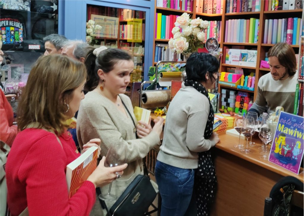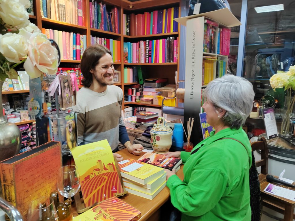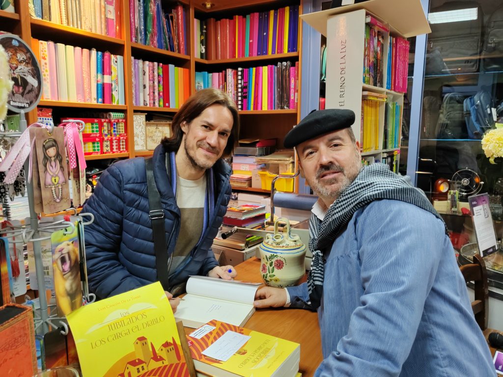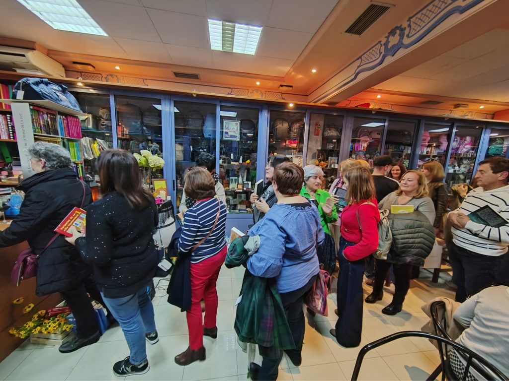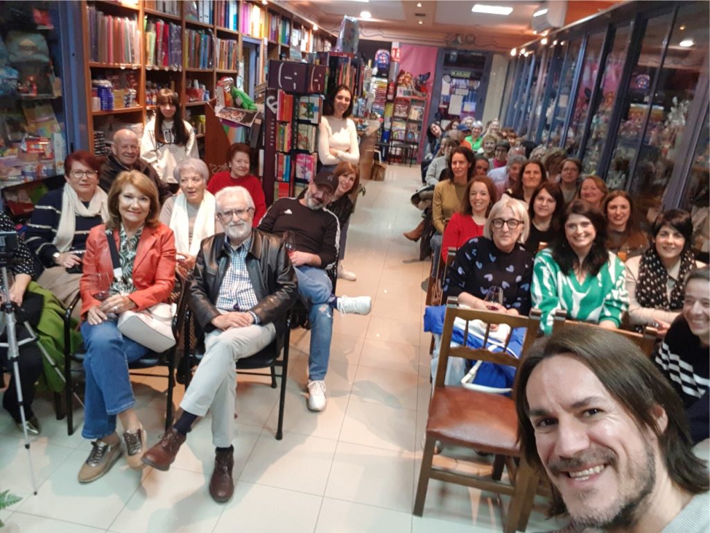 Pero sin palabras le dejaron más tarde al autor, en la presentación en sí, ¡¡porque no le dejaron hablar!! Estaban tan «agustico» dentro de sus roles que siguieron con la performance en la papelería… Así que, entre pitorreos y guasas de los cuatro «jubilados» que le acompañaban, presentó Chacón su novela como pudo. El resultado, a pesar de la locura reinante, fue espectacular, porque los asistentes se lo pasaron pipa con las intervenciones espontáneas de unos y de otros. Fue un desmadre, la verdad, pero quedó muy gracioso.