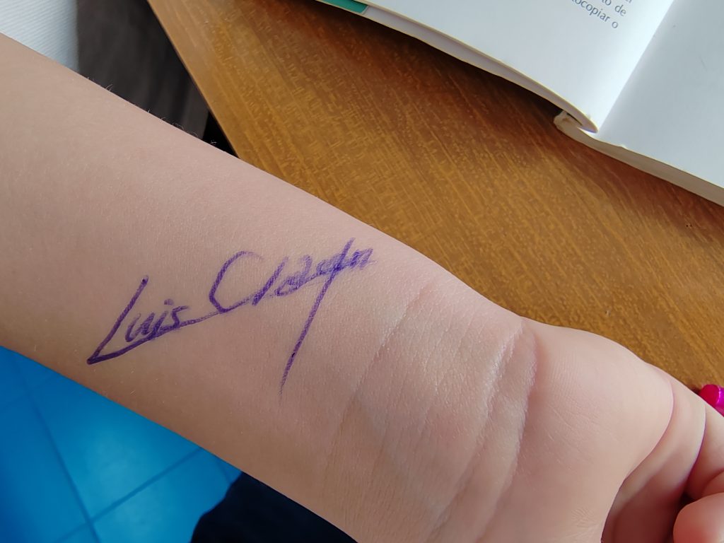 Habló con ellos, respondió a todas sus inquietudes sobre la historia y los personajes, y finalmente les firmó los ejemplares. Alguna niña le pidió que le firmara también en el brazo, y como a los fans no hay que replicarles, así hizo. Adjuntamos la foto como prueba (que sus padres no le regañen, por favor, pero es que se lo pidió con mucha ilusión y le dio lástima no hacerlo, jeje).